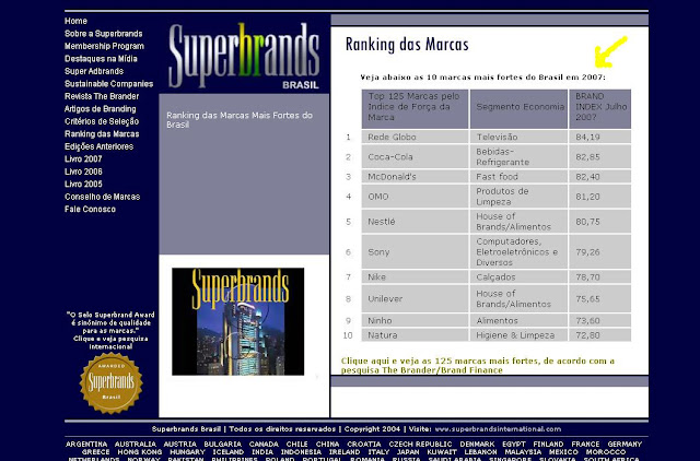 Daí que tentei ter acesso ao estudo para pinçar alguma novidade, explorar algum outro ponto de vista, e qual não foi a minha decepção quando cheguei ao site da Superbrands. Nele não há informação prática para a mídia, nem uma seção com releases... O que há é muita propaganda institucional. Clicando em "ranking das marcas", o que aparece é a lista de 2007! Em newsletters, aparece um pdf de antigas newsletters.
