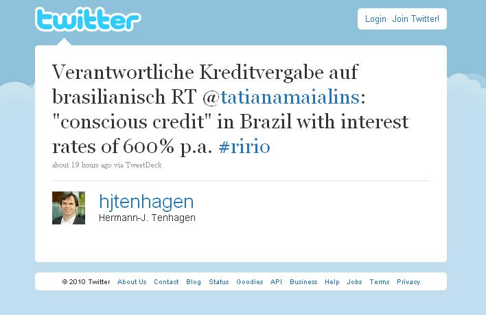 Ainda não recebi resposta do Itaú-Unibanco, mas a minha inquietação acerca do "crédito consciente" no Brasil com juros absurdamente altos ganhou o mundo. Hermann-Josef Tenhagen é editor-chefe da Stiftung Warentest, meu colega na luta pelos consumidores na Alemanha. :-)