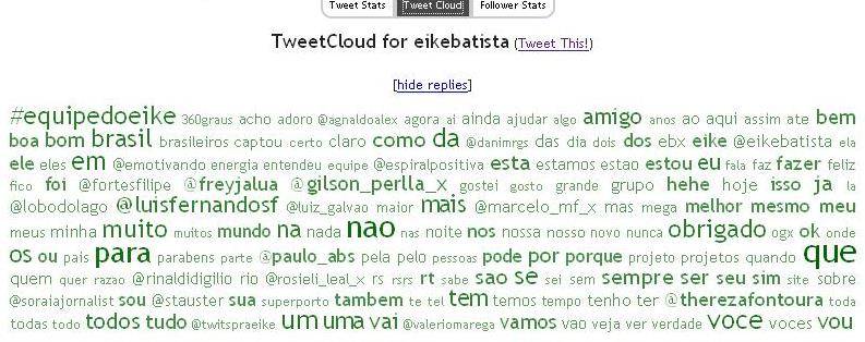 Em resumo, com a sua entrada no Twitter, Eike Batista ganhou voz e conseguiu contar ao mundo a história do jeito dele. E ele achou uma maneira totalmente pessoal de usar a ferramenta. Ele encontrou o tom certo para criar engajamento. As mensagens de Eike não são pesadas nem chatolas. E isso fica claro na nuvem de palavras-chave que mais aparecem em suas mensagens. Há o destaque para vários nomes de pessoas, para palavras como "amigo", "obrigado", para risadinhas e um apelo patriótico com a aparição das palavras Brasil e Rio.