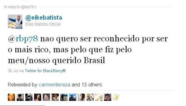 Eike Batista entrou no Twitter em junho de 2010, aproximadamente, três meses depois de ter sido apontado pela Forbes como o homem mais rico do Brasil e o 8º homem mais rico do mundo. Naquele momento, muitos ainda se perguntavam quem era "Eike Batista" e "como ele se tornou o homem mais rico do Brasil". Eike saciou parte da demanda por informação sobre ele respondendo em primeira pessoa e em 140 caracteres. Dos quase 12 mil tweets enviados em nove meses, praticamente a metade foi enviada das 21h às 5h da manhã e 90% foram em resposta para alguém.