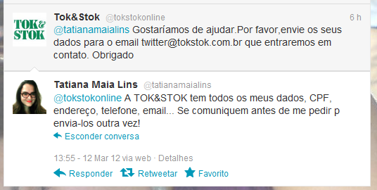 * Ficou clara a falta de comunicação entre os funcionários da empresa. A ouvidoria só soube do caso na segunda-feira. A pessoa que responde os tweets da empresa chegou a pedir para que a vítima mandasse seus dados por email, quando todos os dados dela estão "no sistema" da empresa.